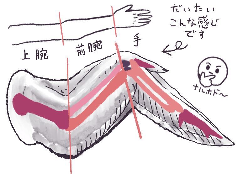 背后有光源的情况下,透过风切羽重叠的地方很漂亮!因为重叠的羽毛少,所以强光能透过。因为鸡翅周围羽毛密集,所以不太透明。