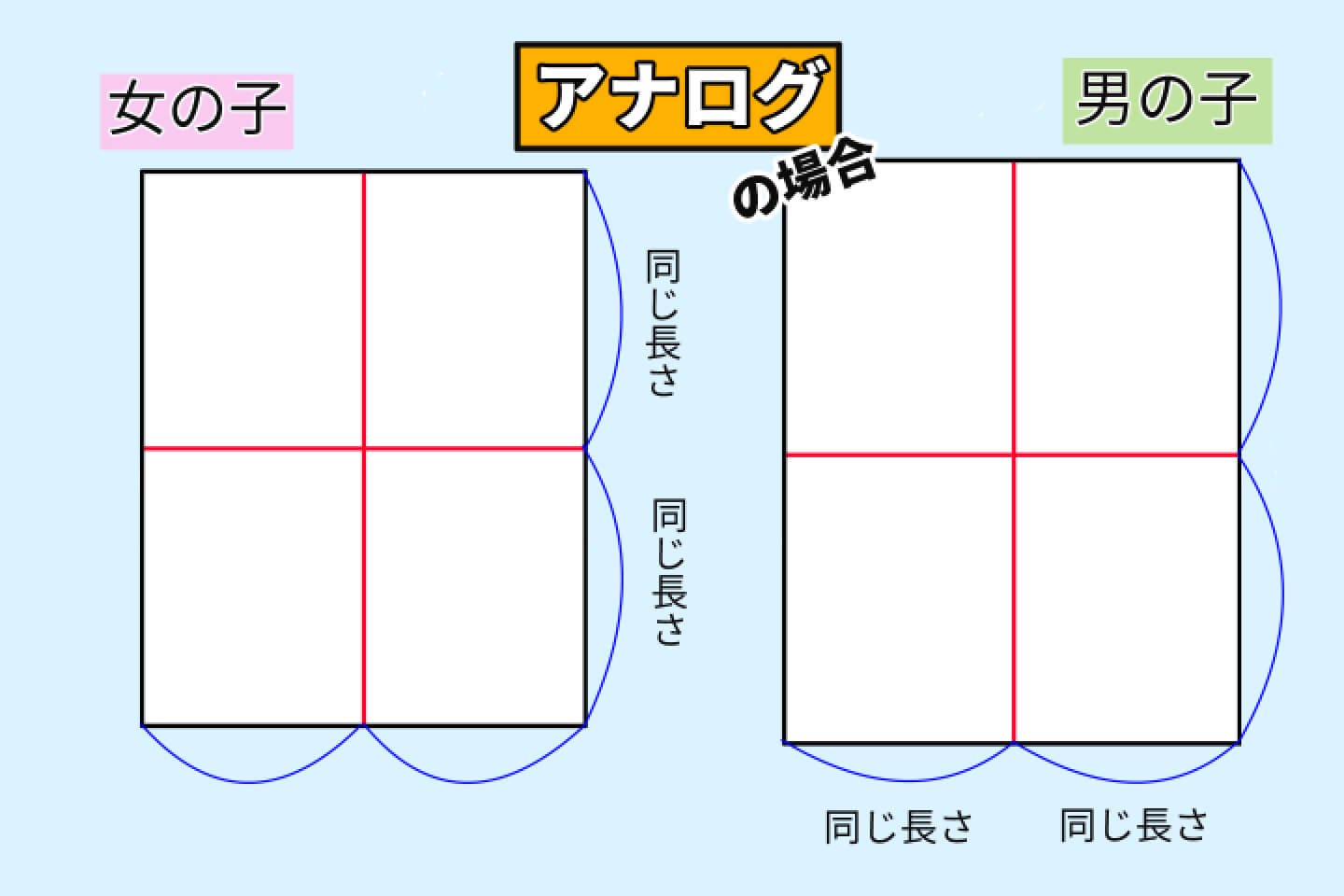 男孩应该比女孩高一点。像红线一样将长度和宽度切成两半。