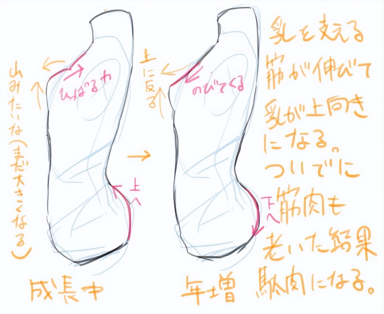 支撑胸部的肌肉伸长了,胸部沿着上面的形状。肌肉也变老了,结果变成了赘肉。
