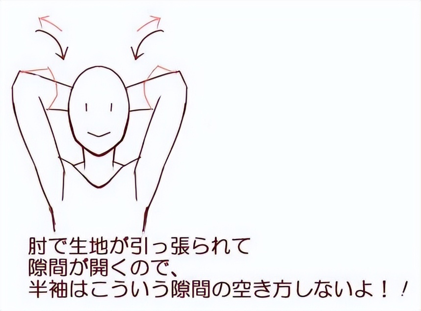 当织物被肘部拉动时,在与手臂弯曲方向相反的方向上会在三角形底座中产生一个间隙。请记住,没有到肘部的面料的短袖没有这样的间隙。