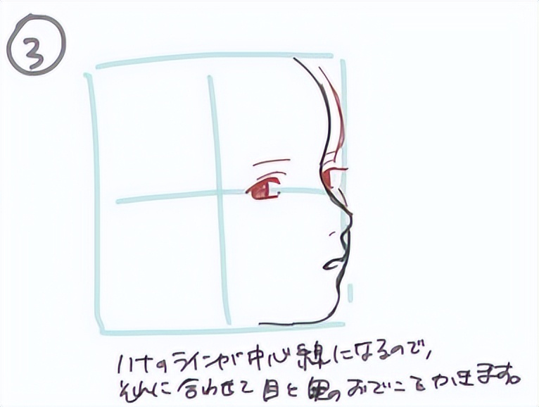 (3)以鼻子的线条为中心线,与之相配合,画出眼睛和里面的额头。