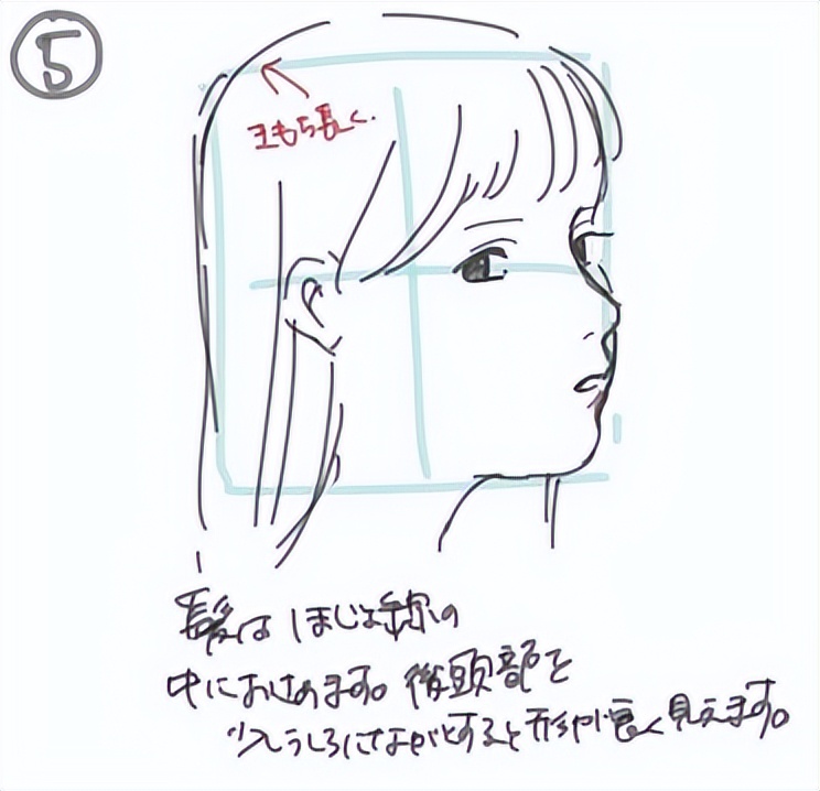 (5)将头发放在辅助线内。如果后脑勺稍微向后长一点,形状会看起来很好。
