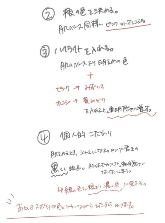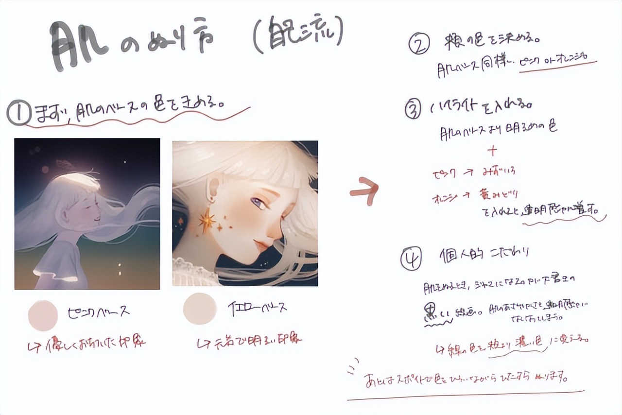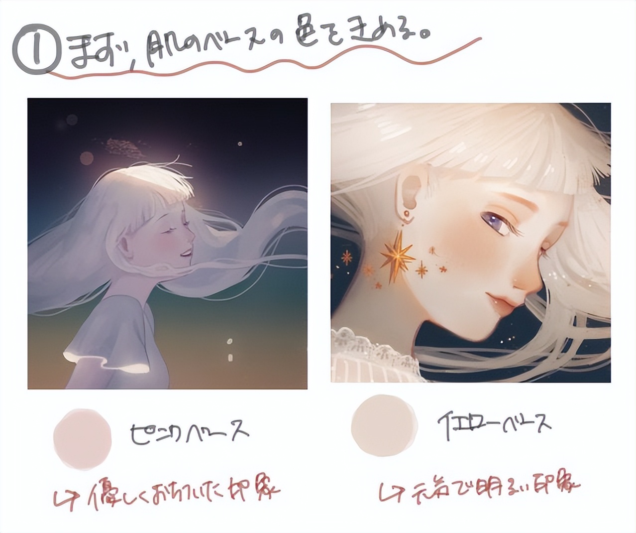 (1)首先决定皮肤基础的颜色。亚希是根据描绘的人物的性格和表情,选择肤色的。左边是什么?粉红色的基础,温柔和平静的印象皮肤的插图,右边是充满活力和明亮印象的黄色基地是皮肤的插图。