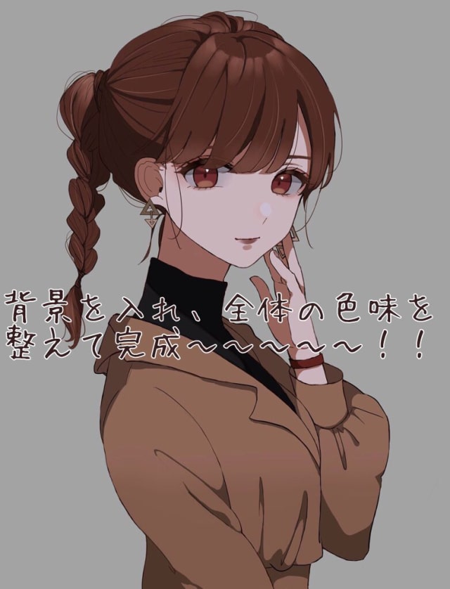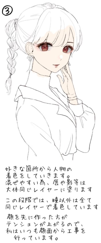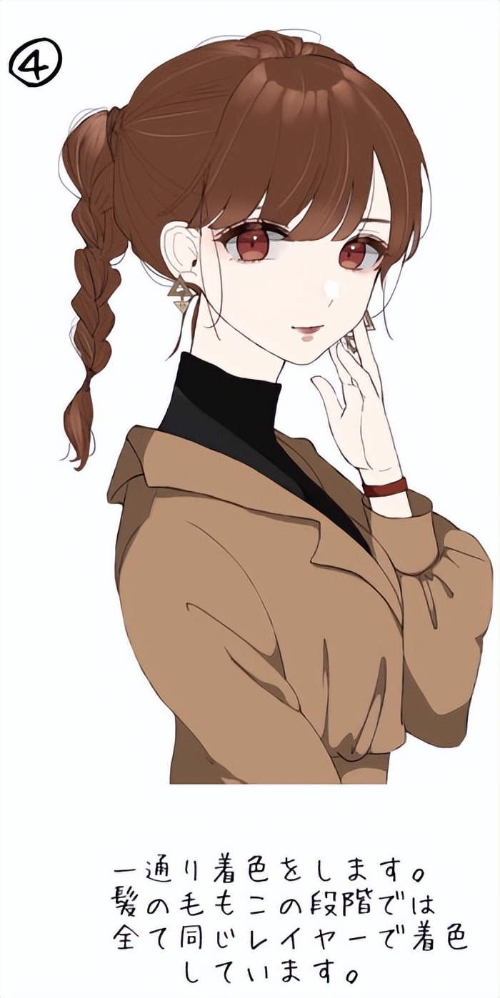 上色差不多结束了。头发也都画在同一层。看刘海的话,就能知道脸上的肤色有点混合了。