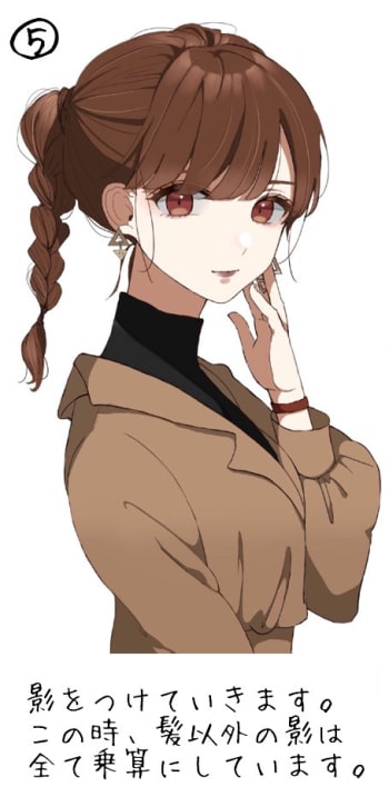 给头发和皮肤涂上阴影。阴影的着色有两个图层,一个是涂头发以外的阴影的乘法层,第二个是涂头发的阴影的通常层。只有头发的影子没有相乘的话,发影的颜色会变得很浓不自然,为了注意自然的颜色,就用普通层涂了。为了更容易涂上阴影色,区分层的合成模式也很重要。