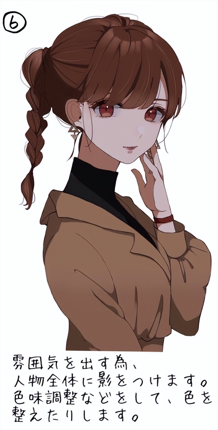 为了营造气氛,给人物全体加上了阴影。在这里,在最上面制作叠加的图层,用浅紫色涂满整个角色,调整颜色的味道。加上通常的影子,整个角色都有淡紫色的影子,哪里都有带着阴郁的神秘气氛。