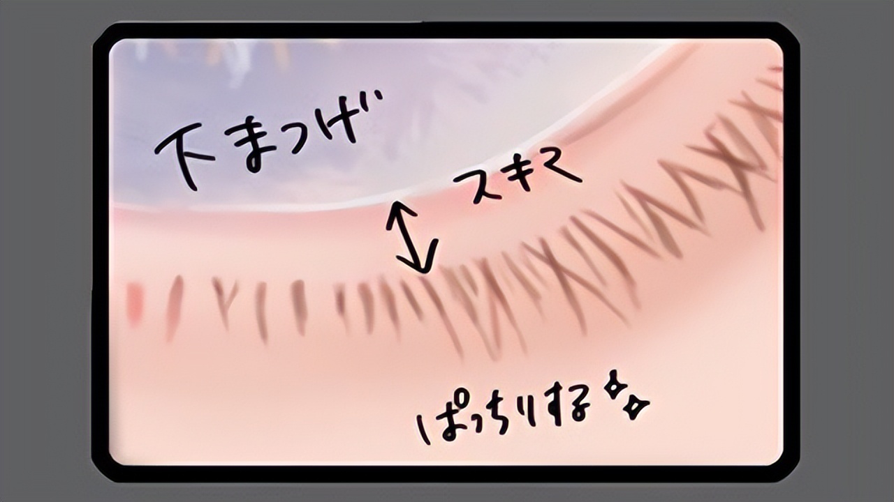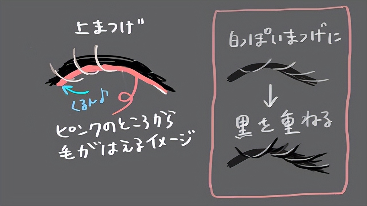 上睫毛用黑色覆盖在发白的睫毛上。另外,让我们用插图中解释的粉红色部分生长的图像进行绘制。