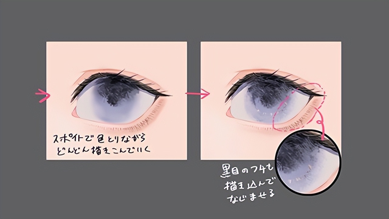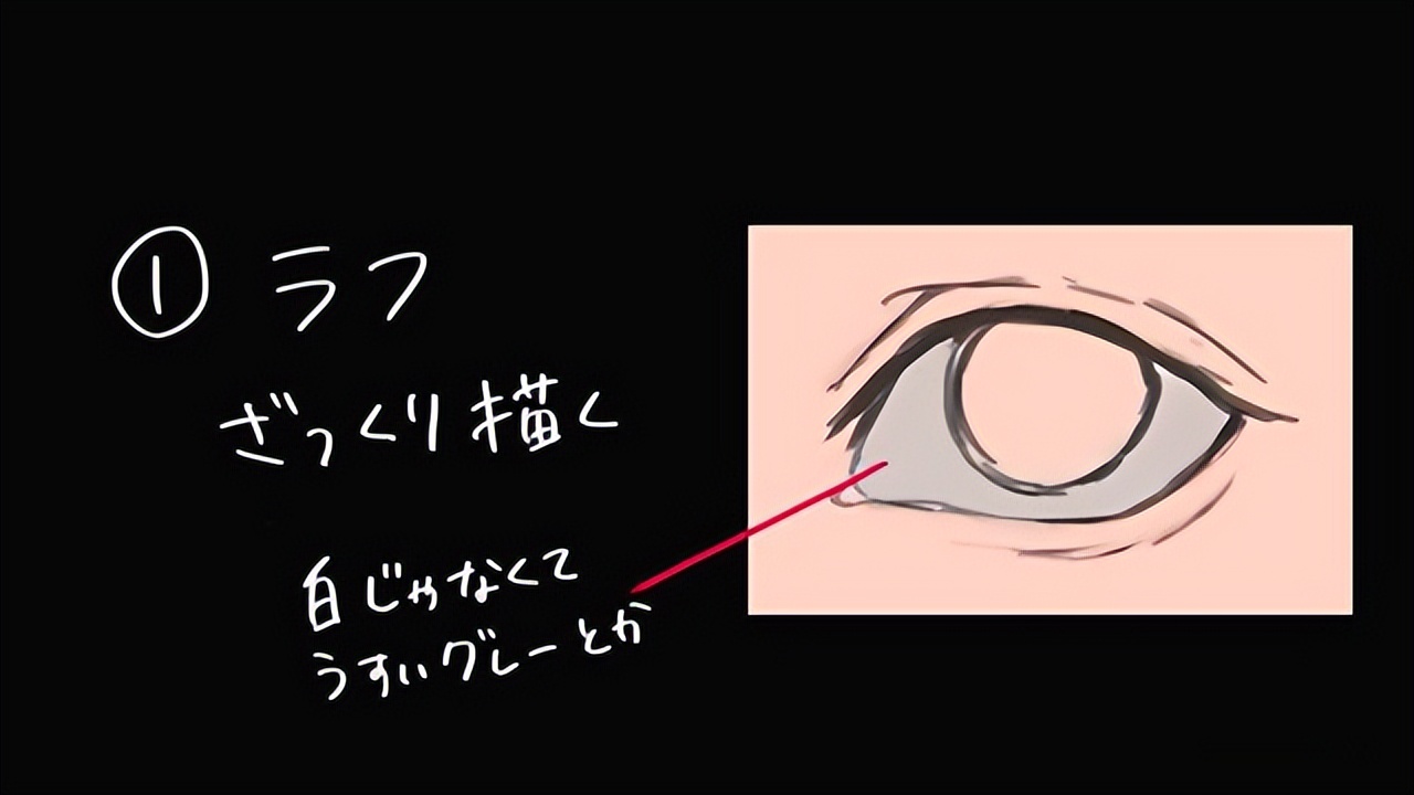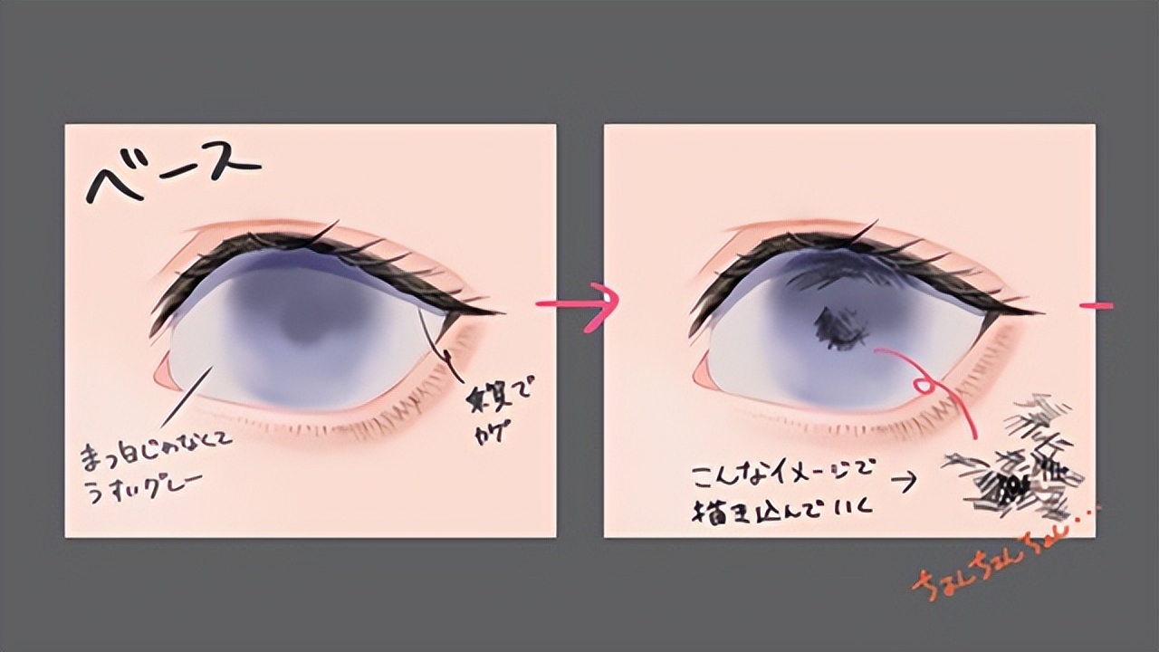 首先从眼睛里的画法开始介绍。正如上次说明的那样,眼白部分涂上浅灰色。