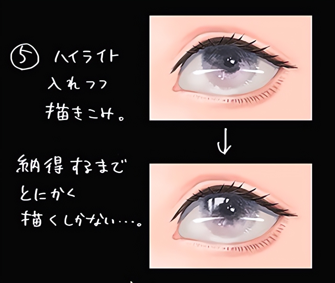 接下来,添加眼部高光。让我们画到你满意为止。亮点很棒,所以也请参考它们。