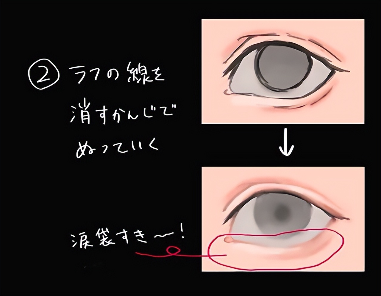 接下来,我将介绍如何添加亮点。用白色填充黑眼圈的上半部分,注意不要让之前画的眼影变白。用橡皮擦擦除填充区域,使其看起来像一个块。