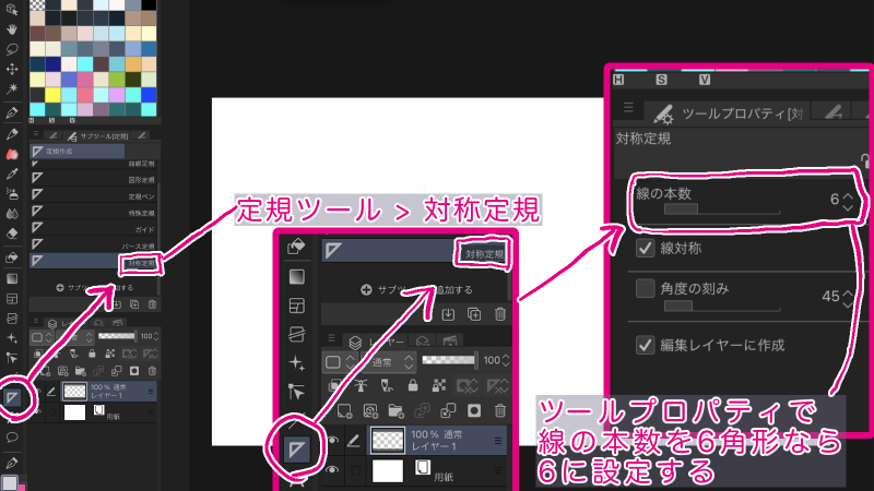 让我们在使用“对称尺”的工具属性更改角度的同时绘制更多内容。