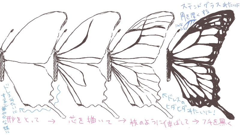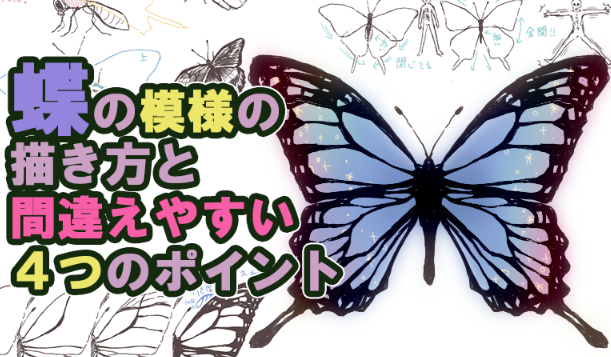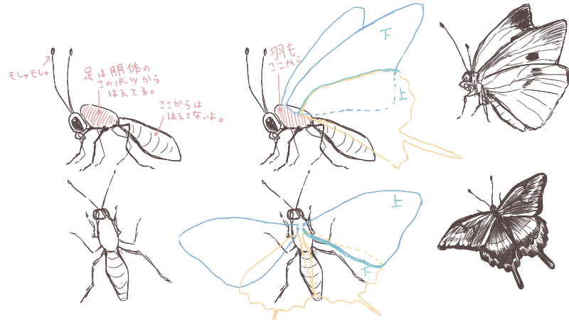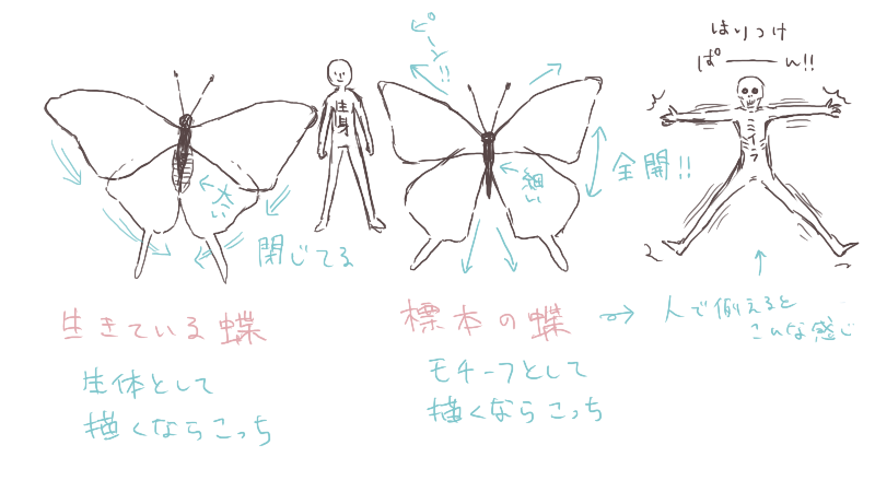 标本蝴蝶为了让羽毛的花纹更容易看到而被展开,身体也干燥变细。如果画成活蝴蝶的话会变得不自然,但是标本的蝴蝶是最美的形状,所以作为主题来画的时候推荐。