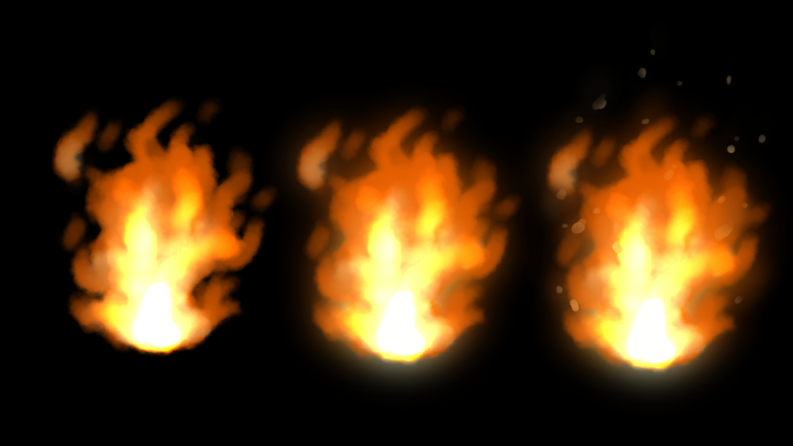 当你发射光粒子时,它变得更像火焰。尤其是当你燃烧篝火或纸时,会飞出很多火花。一定要画出来。