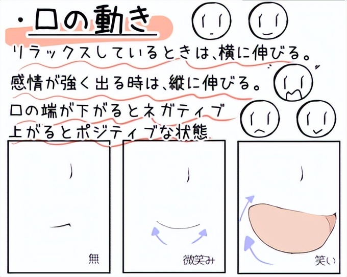 放松的时候,向旁边伸展。感情强烈的时候,会纵向伸展。 嘴端下降的话,消极上升的话,就会处于积极的状态