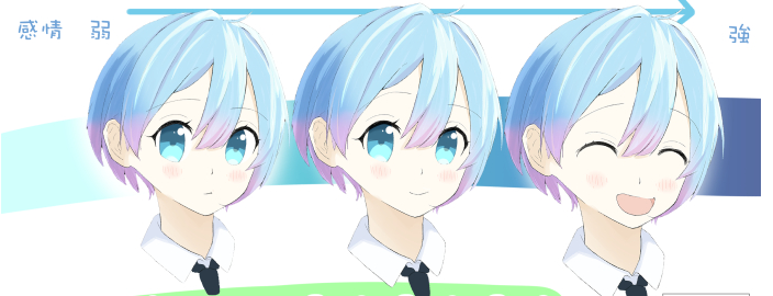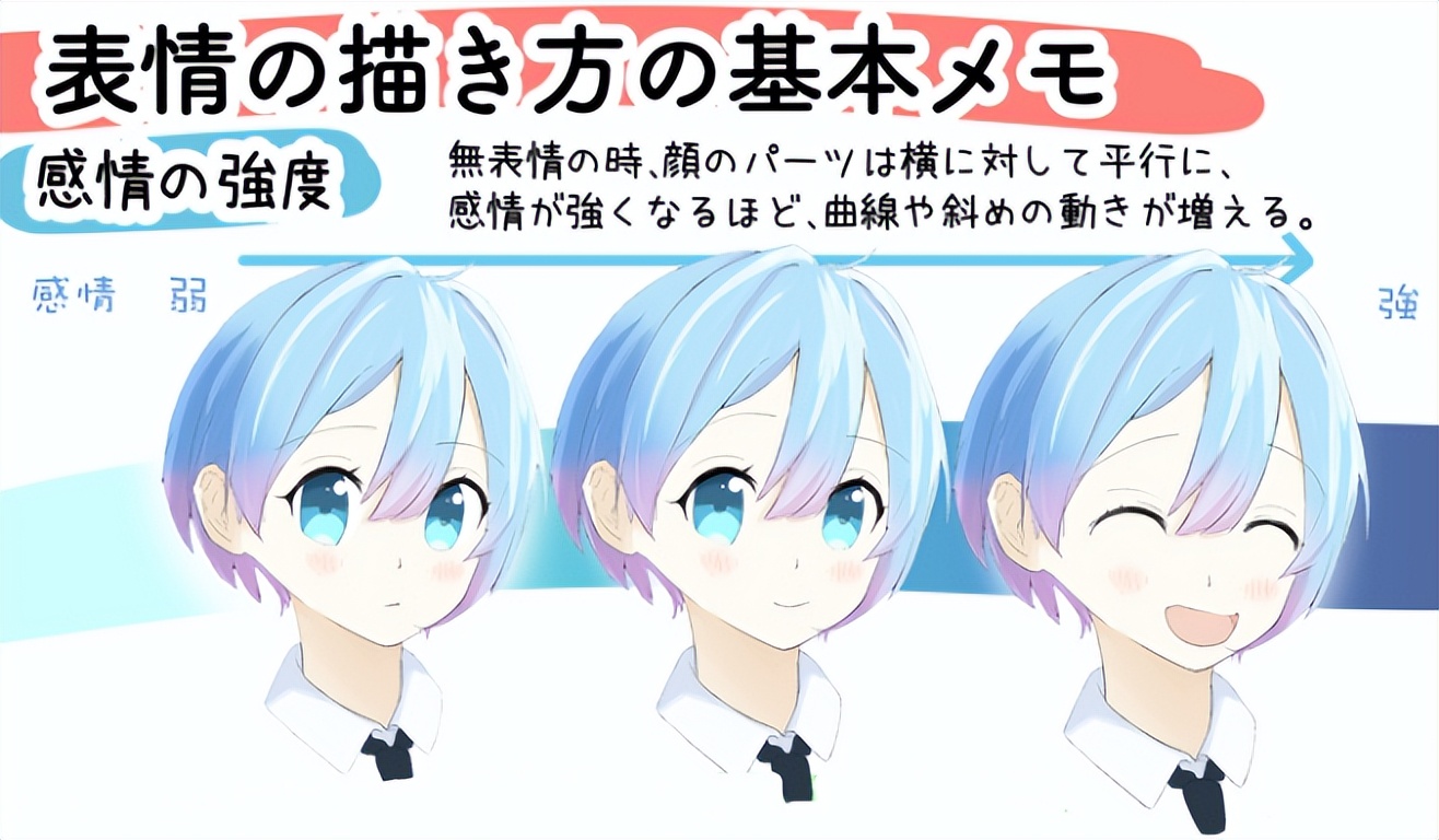 无表情的时候,脸部的部分与横向平行,感情越强烈,曲线和倾斜的动作就越多。