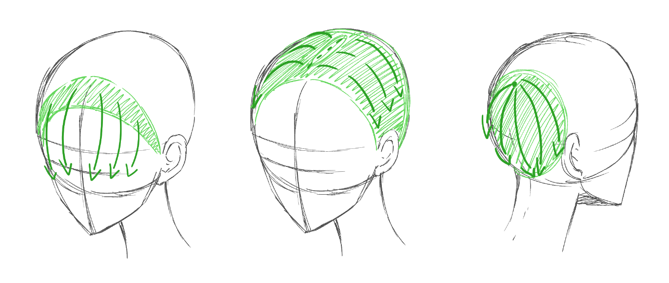 有头发的头部区域分为三大部分。 这个方案有助于观察毛囊在哪里出生,它自然脱落的方法。 因此,即使您想绘制复杂、非常有创意的发型,也可以保持它们的一致性,使其与现实的发型一样自然。