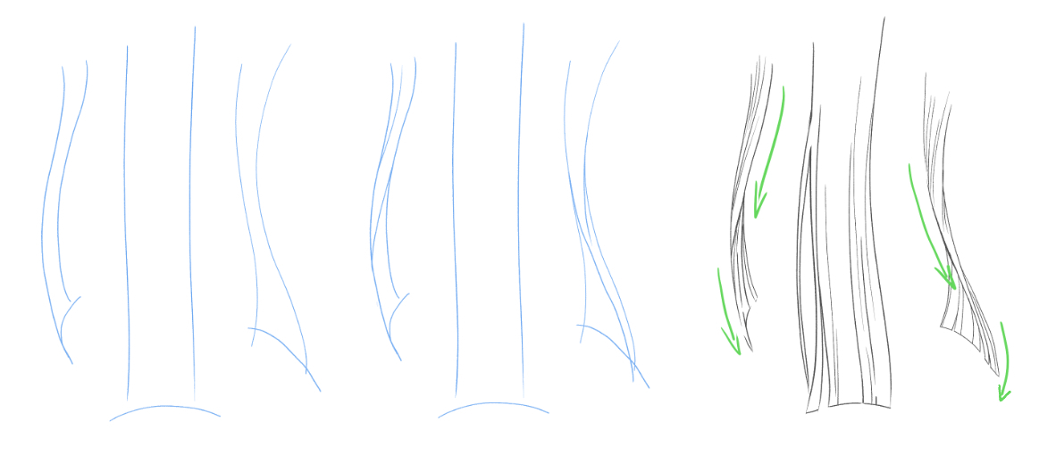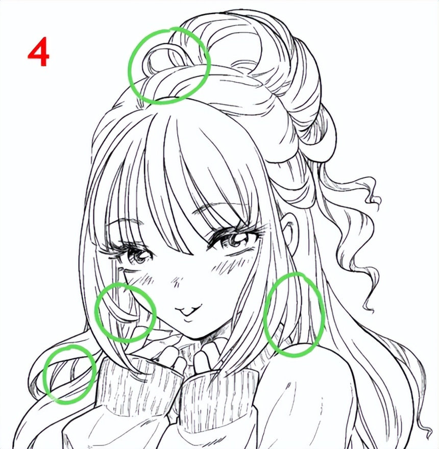 在画这种类型的头发时,最重要的是不要忘记沿着绿色箭头的方向增加头发的笔画。 请看下面第一幅图像和第二幅图像的区别。