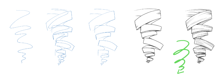 要创建软木塞开瓶器,首先需要绘制“s”形线条,如下面图像中的第一个绘图所示,以极大地夸张曲线。