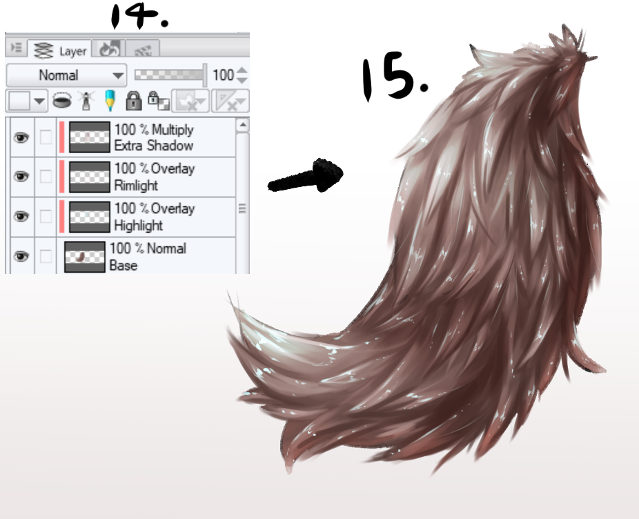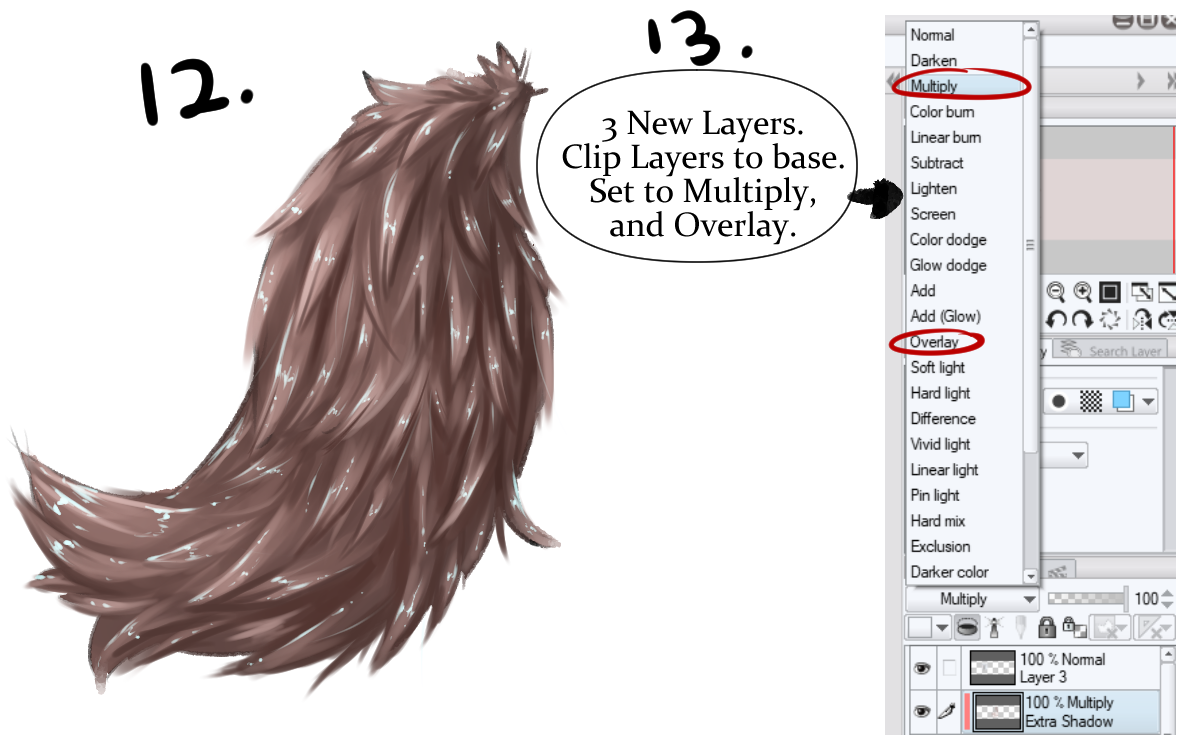 步骤13、14::创建三个新层。 在绘制的毛发图层上剪裁新图层,将两个新图层设置为“叠加”,将一个新图层设置为“叠加”。