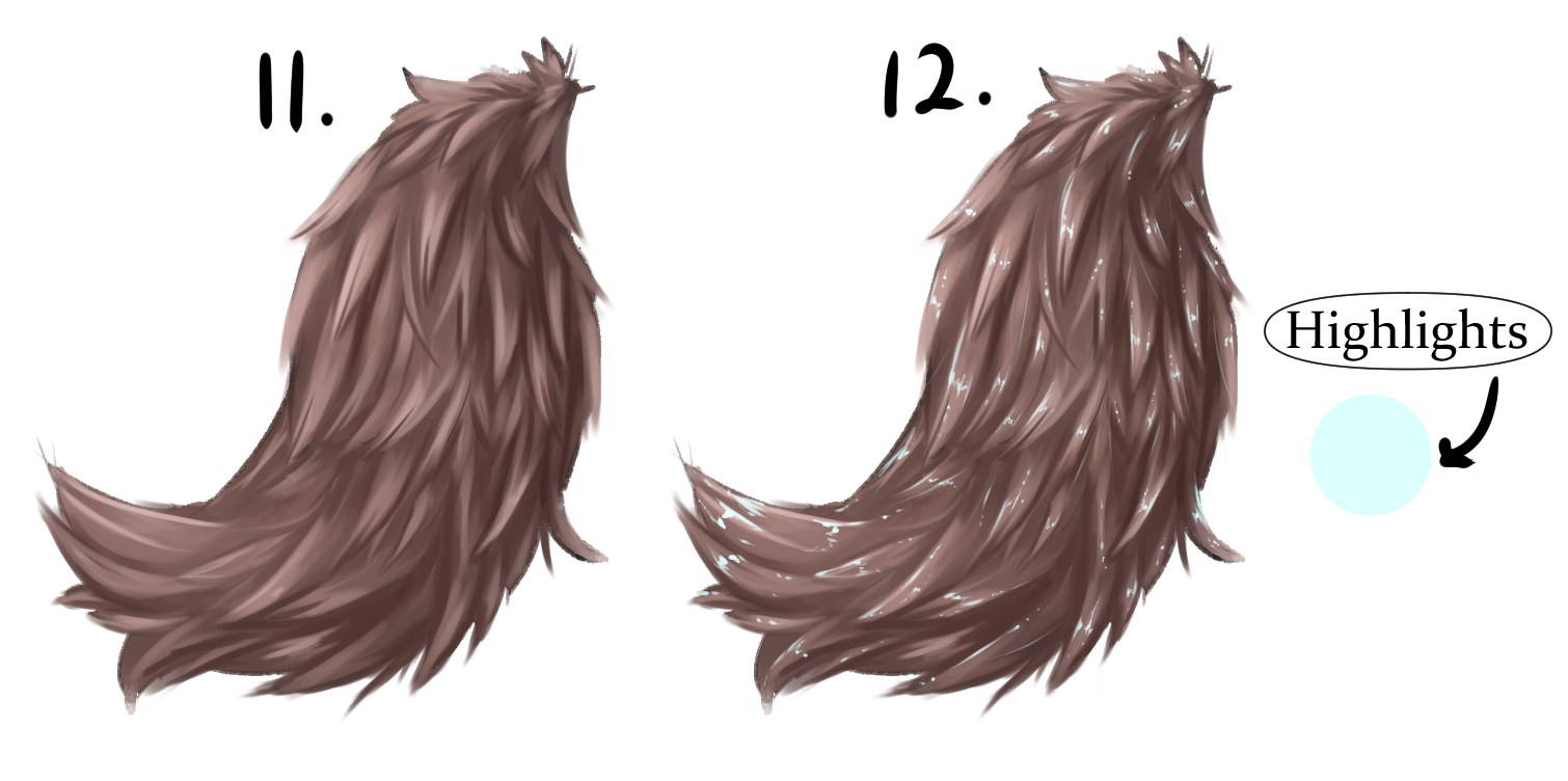 步骤9、开始在常见毛皮股线掉落的地方添加阴影。 请理解毛皮有特定的方向,它根据动物各个身体的部位而不同。 对于尾巴,毛皮一般向下移动。