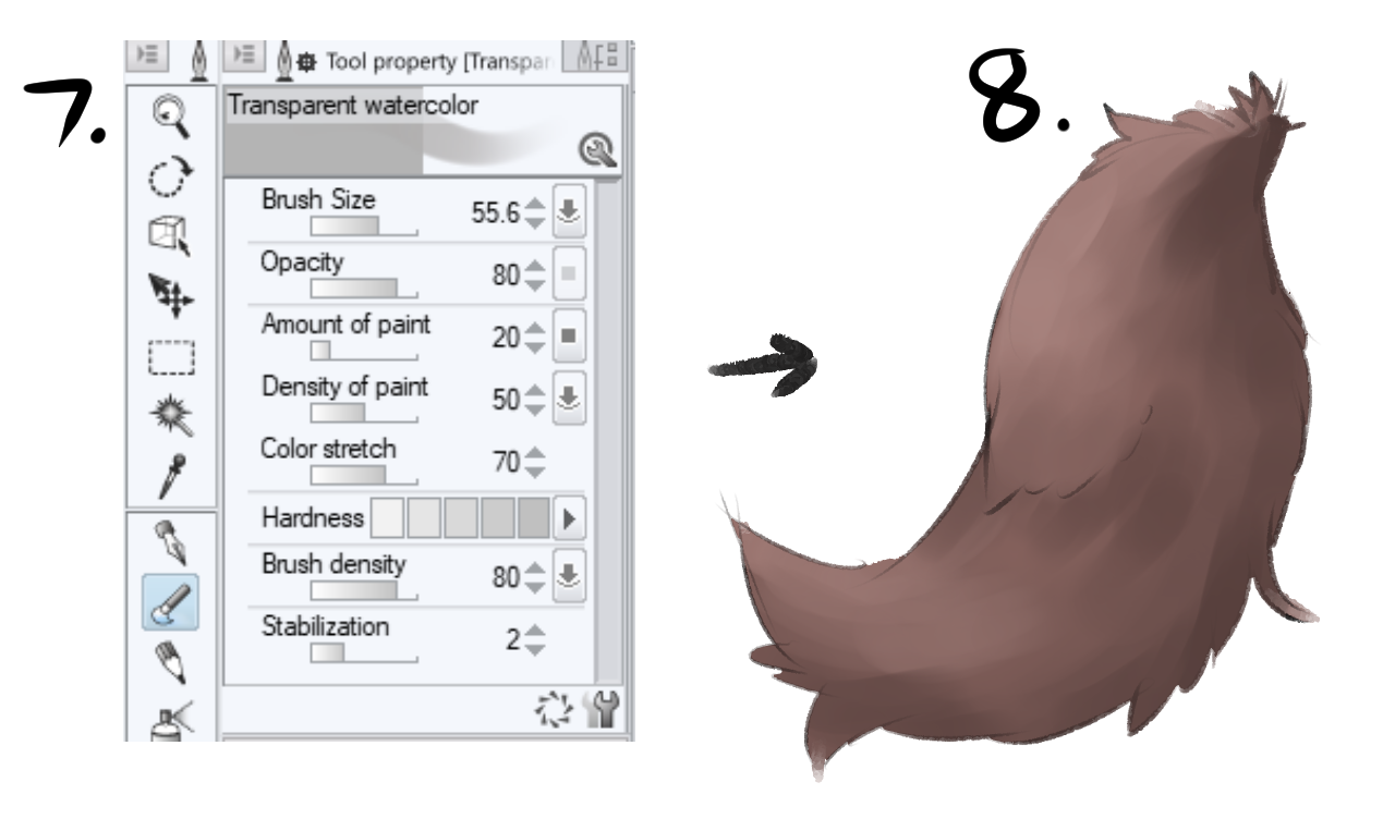 步骤11、通过定义线条的阴影和高光边,减小水彩笔并增加毛发接触。 建议使用拾色器工具轻松获取当前存在的颜色。 必要时将阴影调暗。