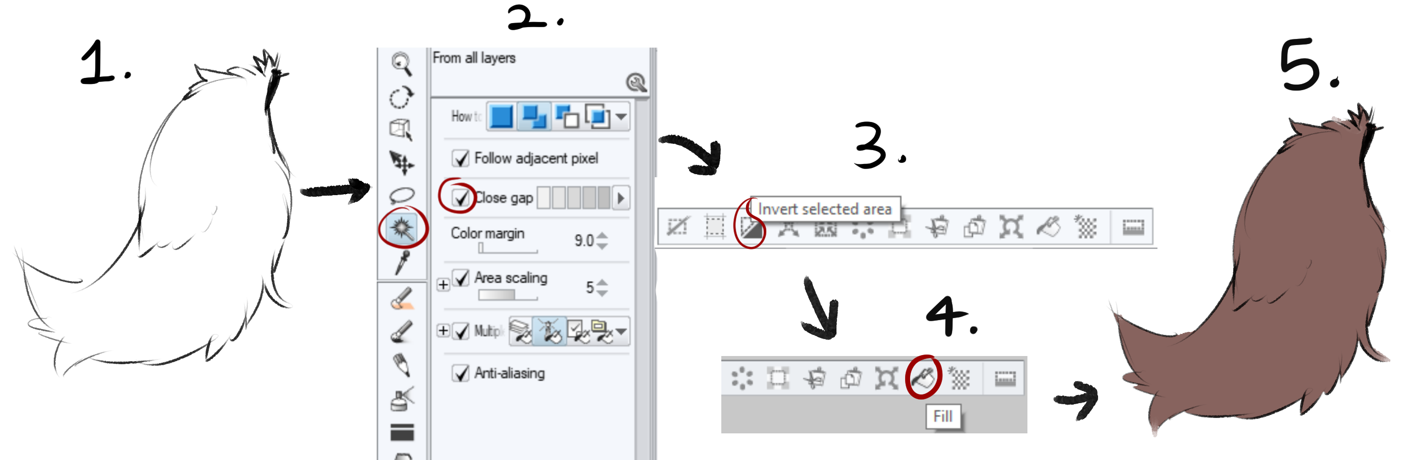 单击图层菜单上方的灯塔图标,将草图图层设置为“参考图层”。在它下面的颜色中创建一个新层。选择“魔术棒”工具,如果你有一个像我一样有很多间隙的粗略草图,请确保启用“填充间隙”。单击画布上艺术线条外的任意位置以突出显示所选内容,然后对其进行填充。