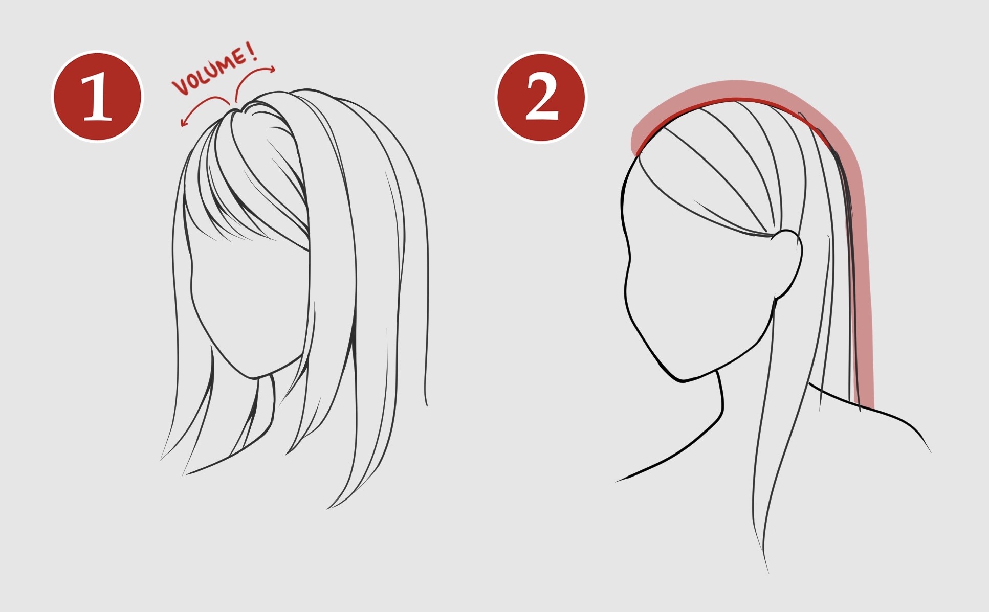 不要把头发画成头部的形状,从上面一点开始。这为您提供了 3D 外观(参见 1)。