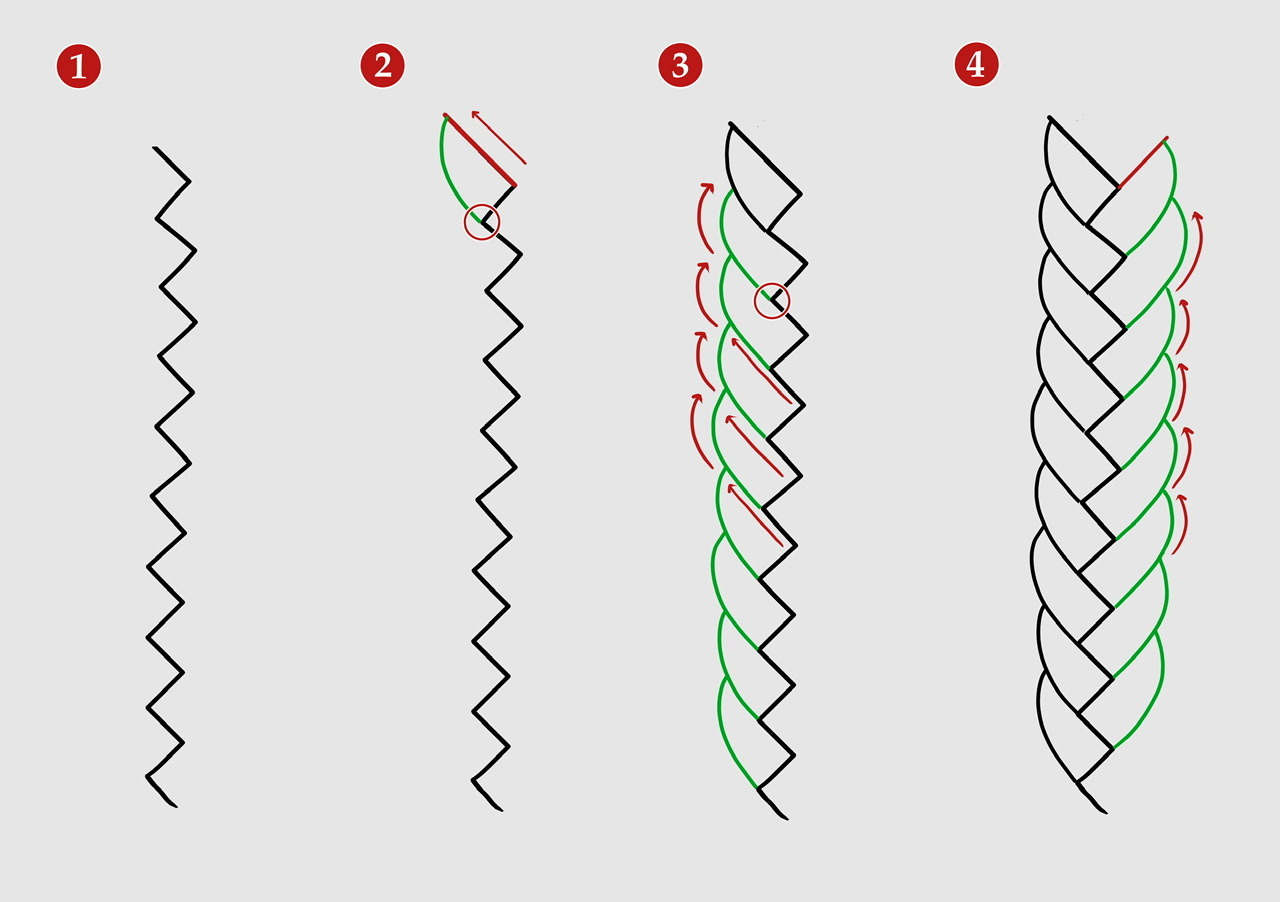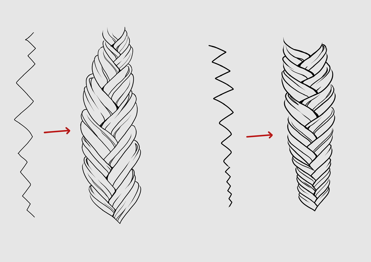 以添加更多细节,直到刀片完成。不要在每个部分中重复模式,而是尝试更改您添加的行。这样,辫子是对称的,看起来不有机。