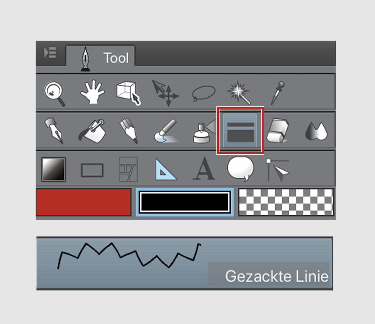 Clip Studio Paint 有一个方便的工具,可以轻松绘制刀片。它是一种锯齿线工具,可以通过选择[子工具(装饰)]->[线条工具]->[锯齿线]来选择。