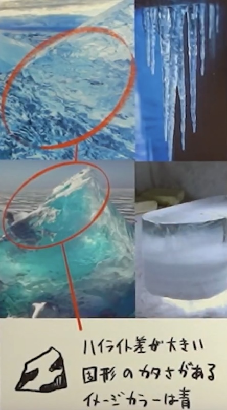 这次为了描绘效果,以冰的图像颜色的蓝色为基础。 通过强调光照的高光,产生对比度差,可以表现冰的硬度。