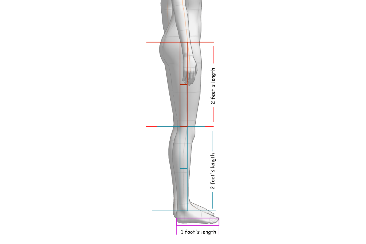 同样,从膝盖顶部到骨盆的距离是脚长的两倍。