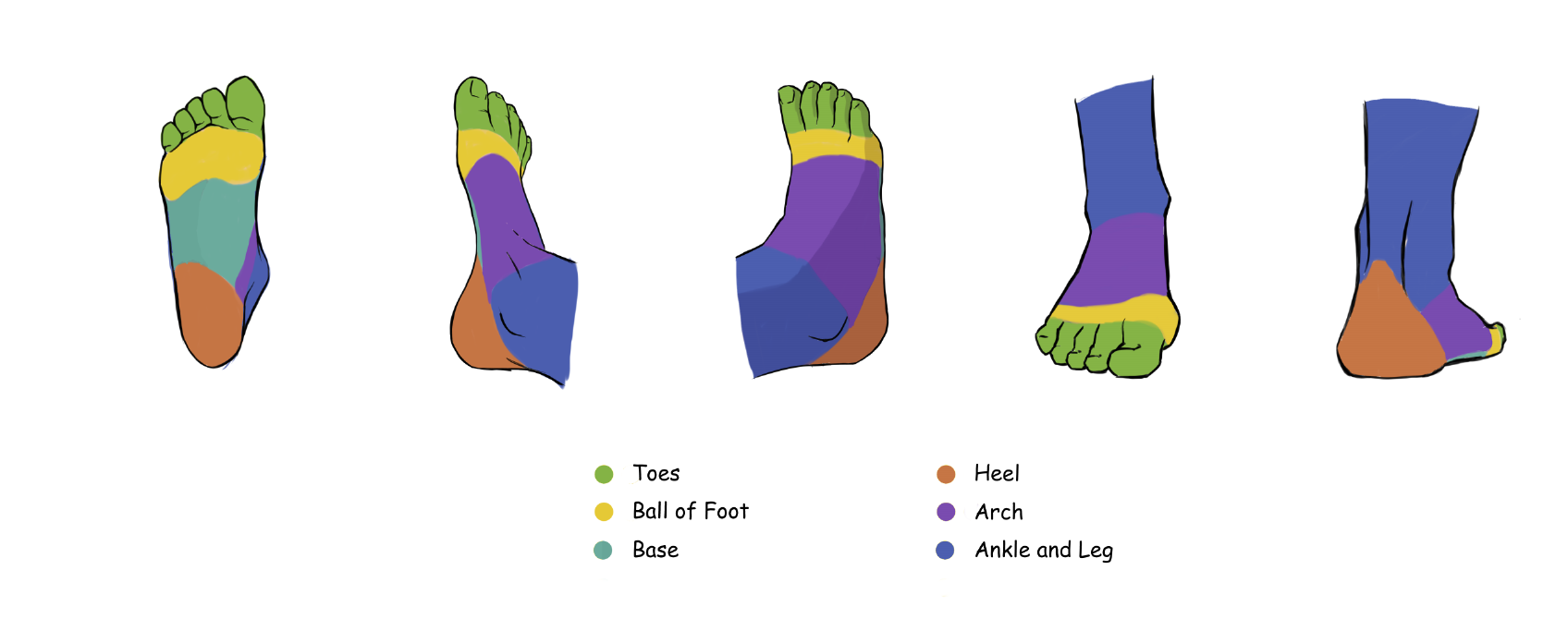 这些部分如下图所示,具体如下:脚趾(绿色)、拇指球(黄色)、底部(浅蓝色)、脚跟(橙色)、足弓(紫色)、脚踝和腿(深蓝色)。