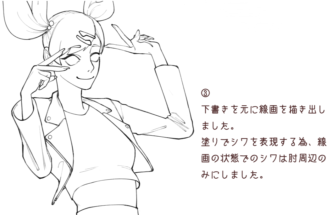 以草稿为基础画出了线条画。为了用涂抹来表现皱纹,线画状态下的皱纹只在肘部周边。