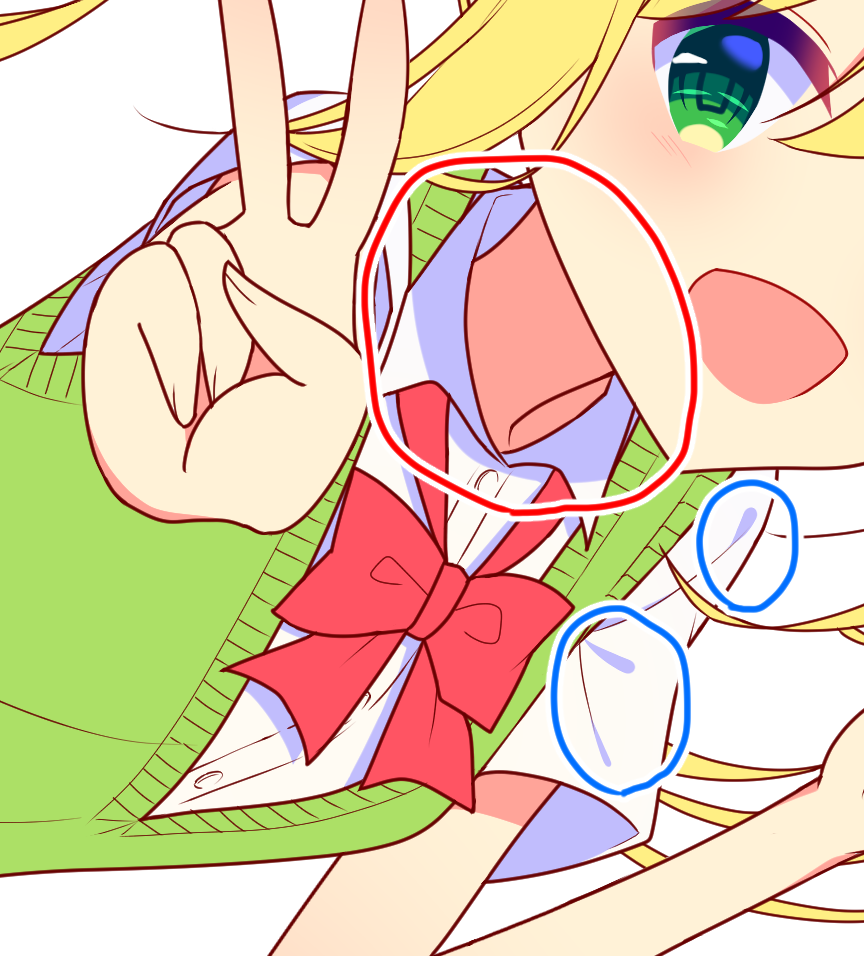 在头上涂一个大阴影(红色圆圈),在衬衫的皱纹上涂一个小阴影(蓝色圆圈)。