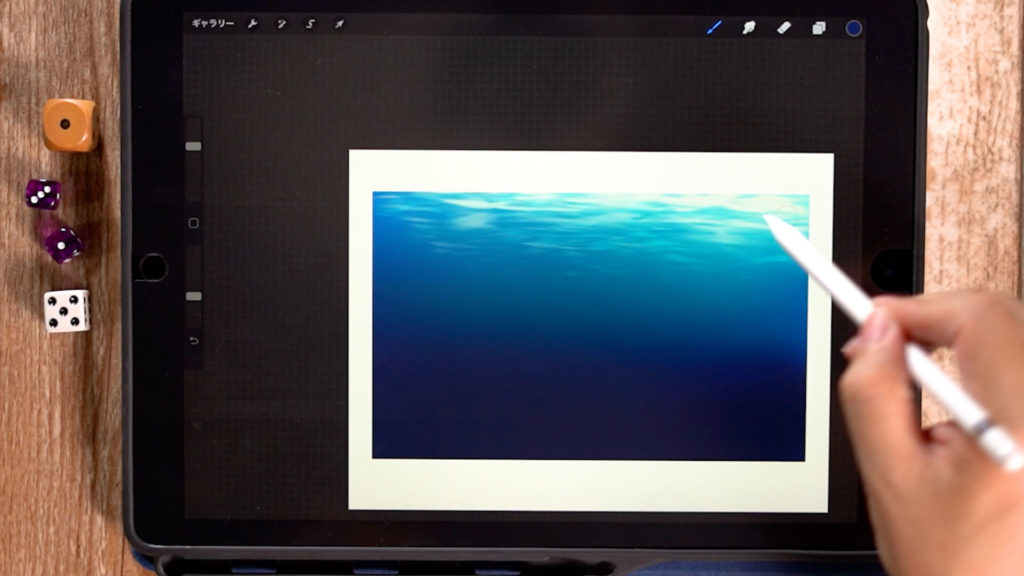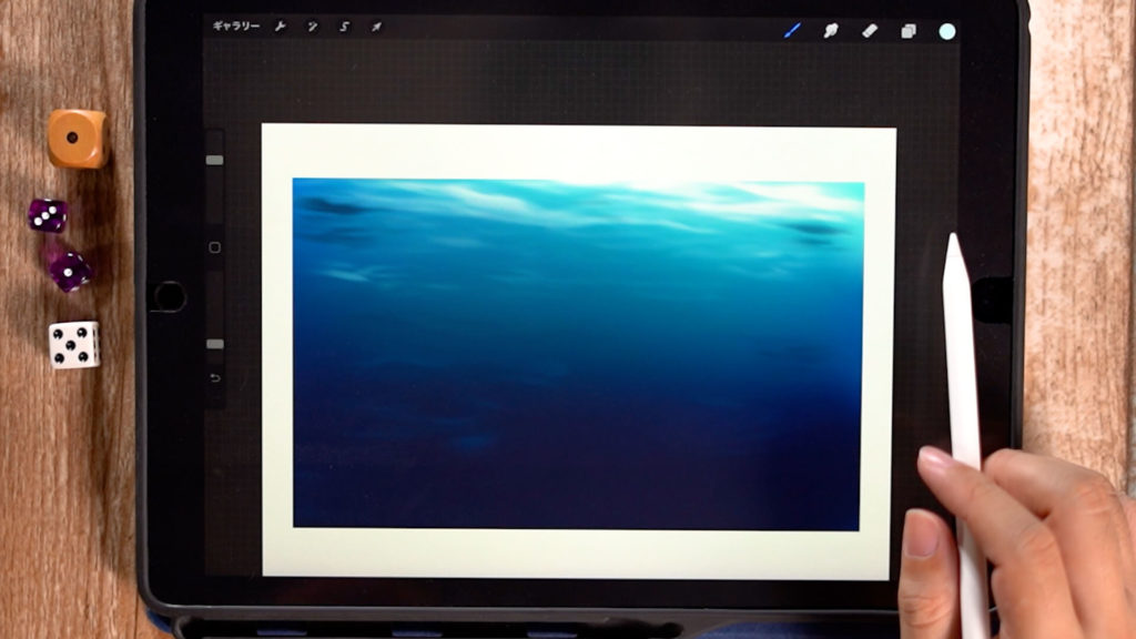 用明亮的颜色加入水面的光。 里侧也缩小刷子大小,降低透明度,加入较小的光。