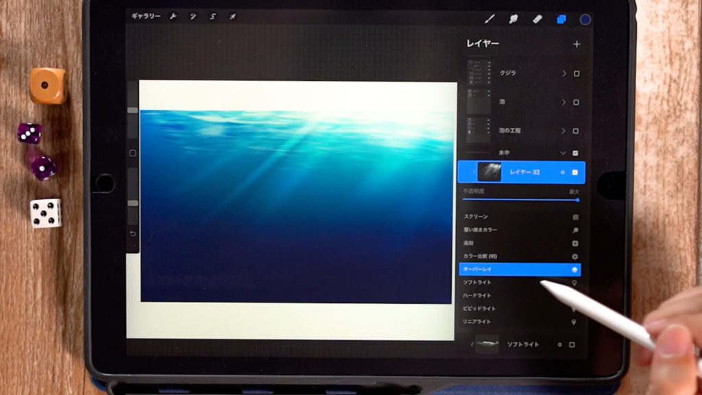 对于图层效果,再创建一层“柔光”,添加蓝色水面的光。插图会更深。