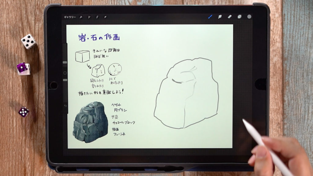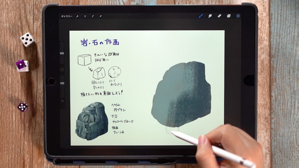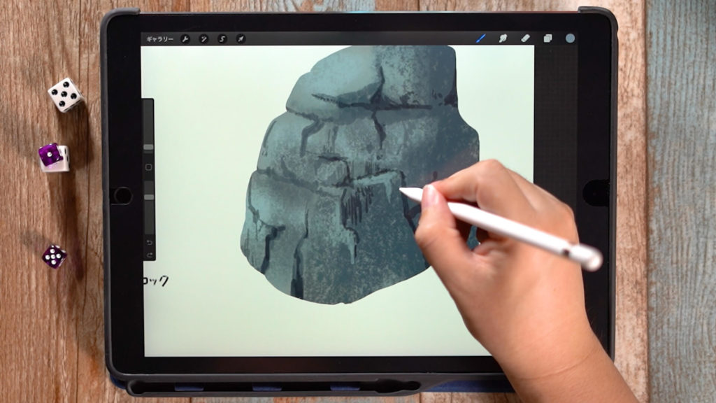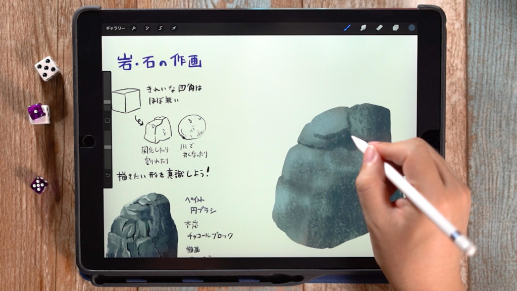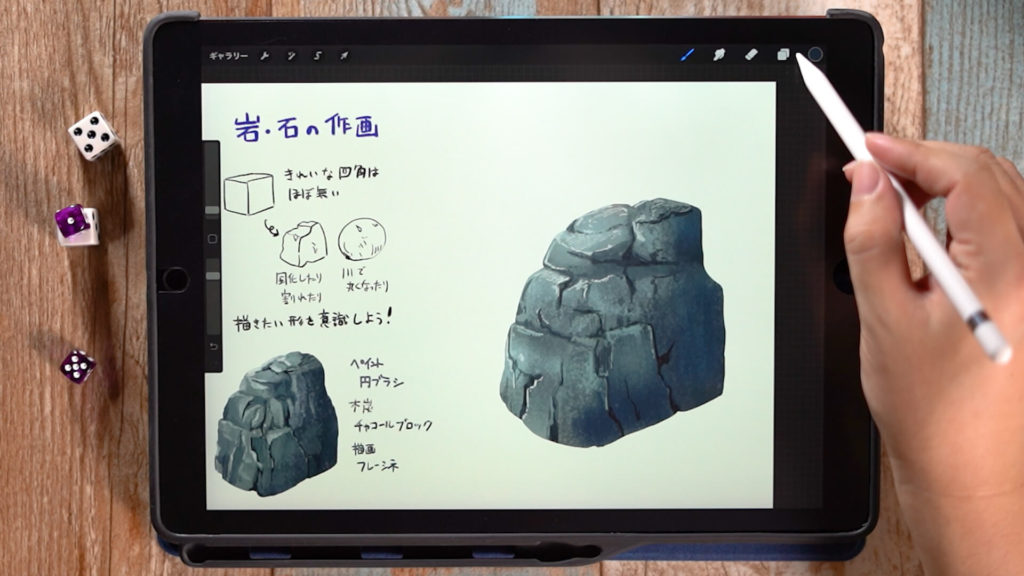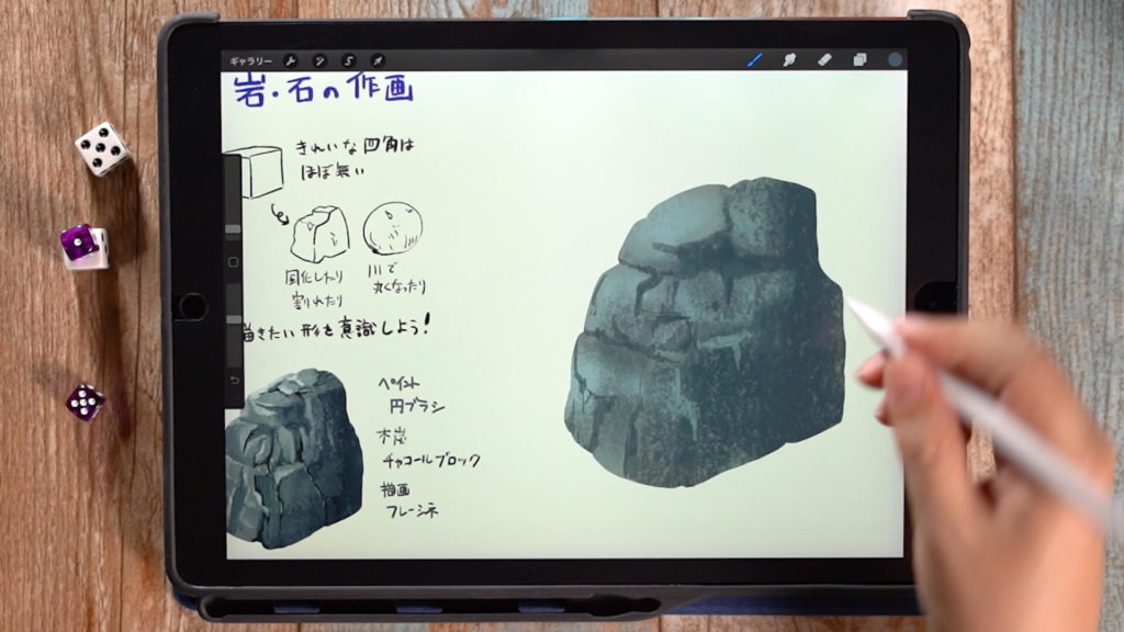 另外,由于岩石是凹凸组合而成的,所以光和影交替描绘,一边思考着能看到哪里的面一边画画。