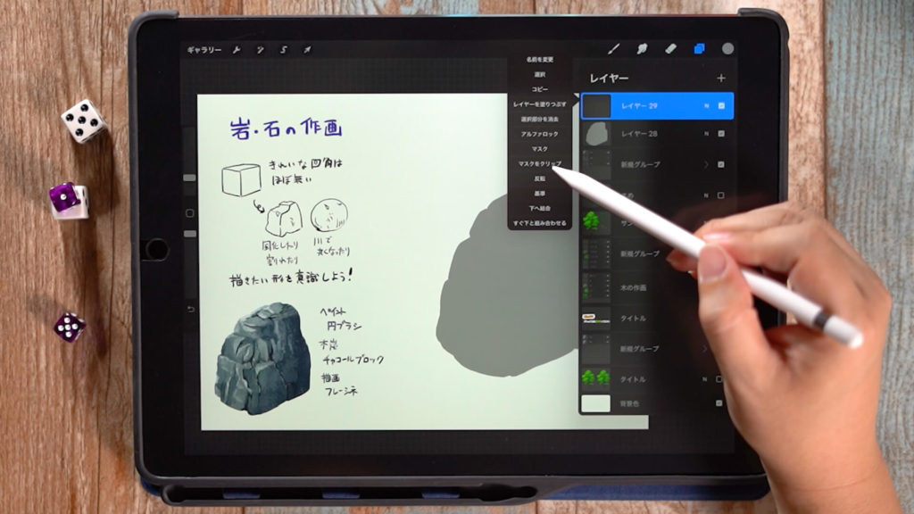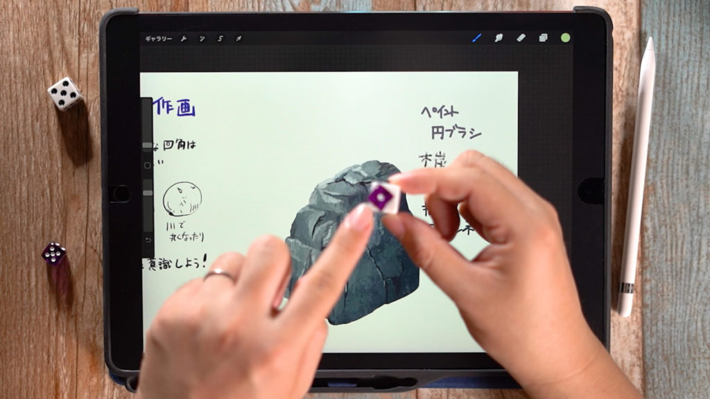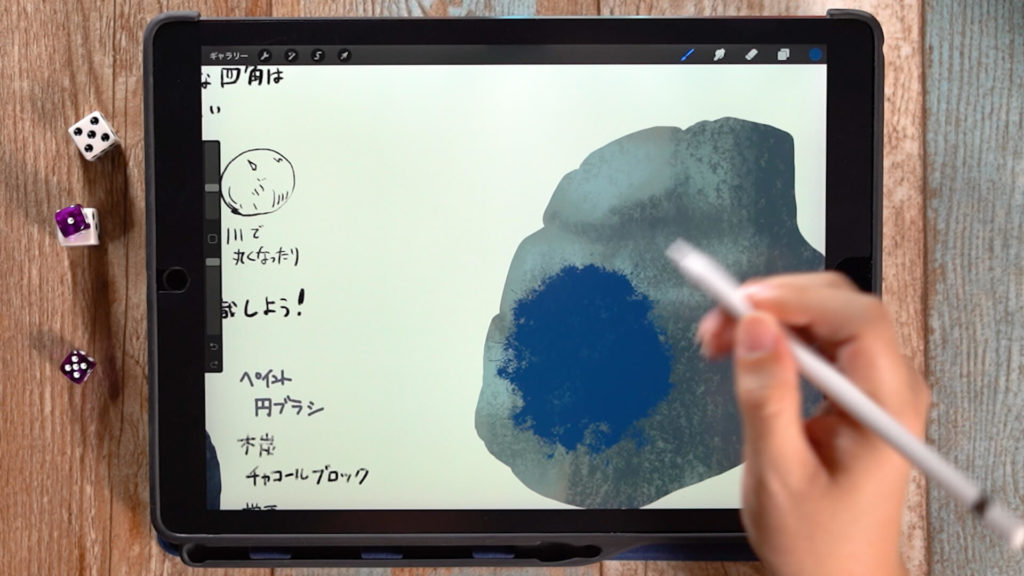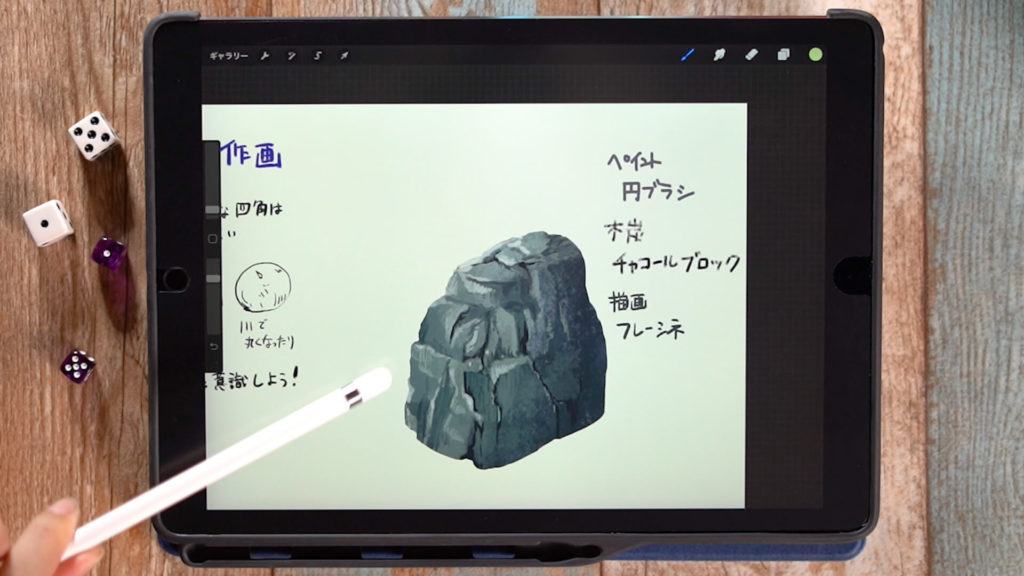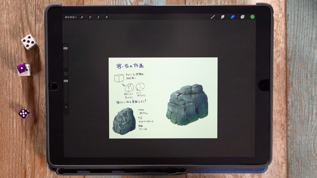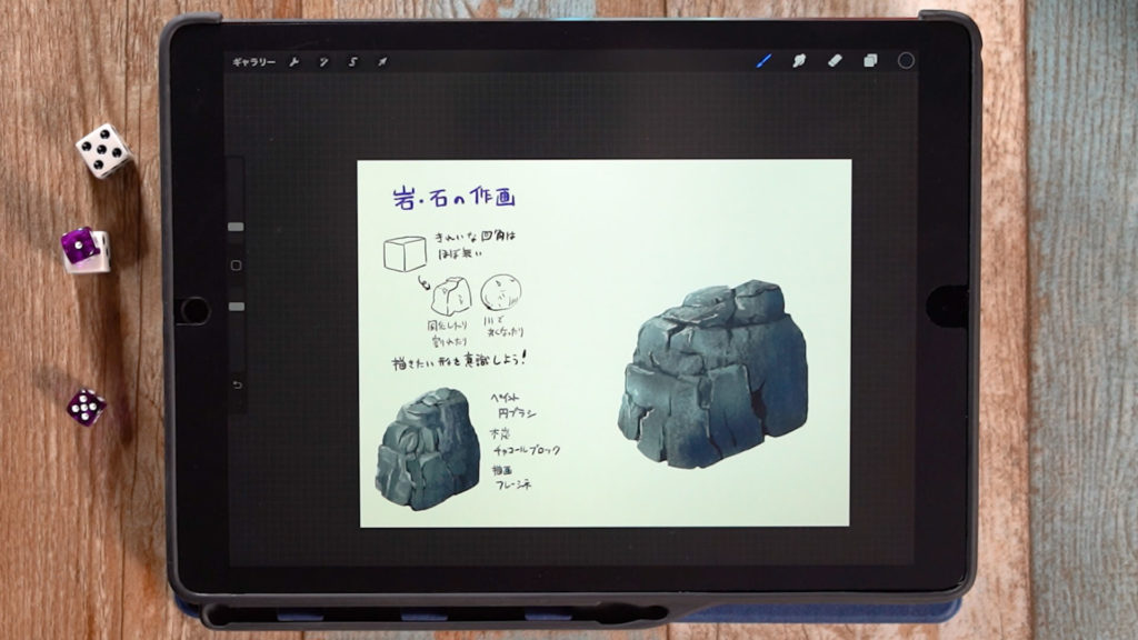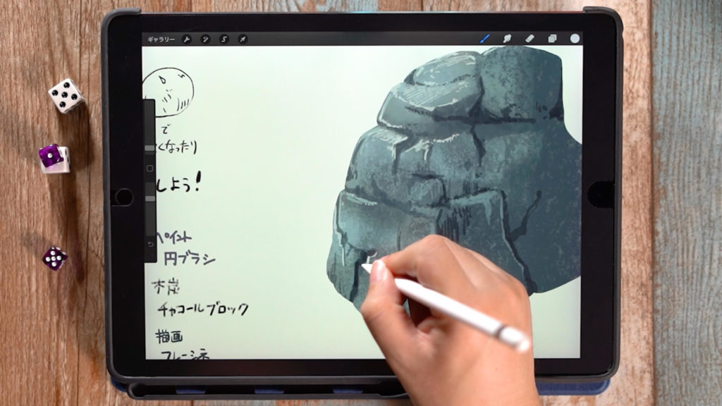 另外,由于岩石是凹凸组合而成的,所以光和影交替描绘,一边思考着能看到哪里的面一边画画。