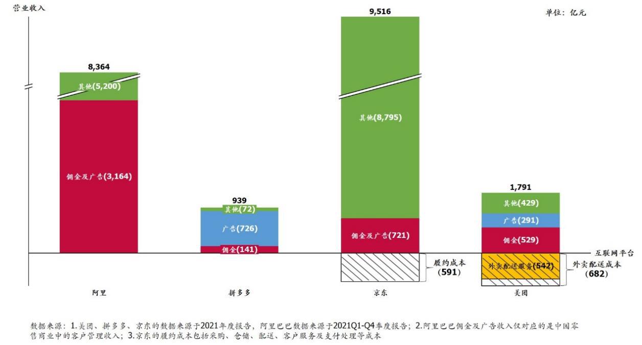 服务电商,顾名思义,它的主要作用在搭建渠道之外,还有提供服务,帮助完善电商零售业务的闭环。2021年,美团从商家、用户处收取的餐饮配送服务收入为542亿元,而全年骑手配送成本为682亿元。上述数据表明,收入和成本之间仍有无法逾越的鸿沟。