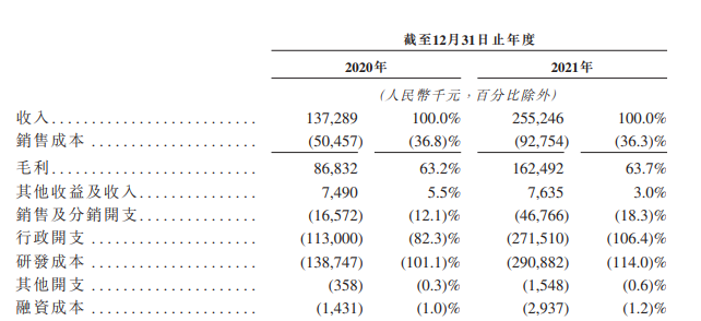 从上图的数据来看,行政开支和研发成本,是该公司开支的主要部分。根据招股书显示,英诺伟2020年及2021年,研发成本分别为人民币138.7百万元及人民币290.9百万 元,分别占总收入的101.1%及114.0%。于2020年及2021年,公司的行政开支分别为人民币113.0百万元及人民币271.5百万元。