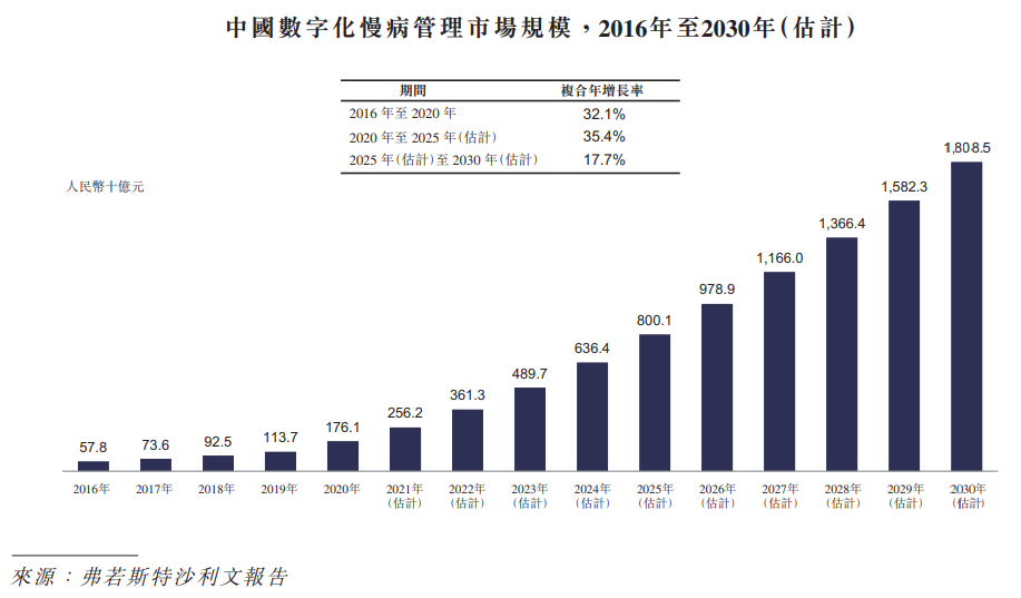 除了老人群体的慢性病患者,近十年来,我国慢性病总体人数也在不断增长,据弗若斯特沙利文数据显示,中国数字化慢病管理的市场规模由2016年的人民币578亿元增至2020年的人民币1761亿元,期内复合年增长率达32.1%;并预期到2027年将突破万亿元市场规模。