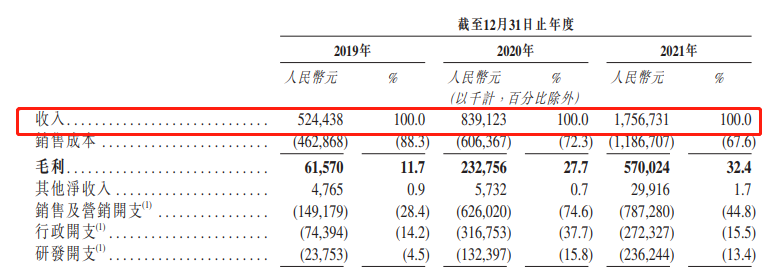 随着业务体系的搭建与完善,能够发现的是,智云健康有着不错的核心增长力。据招股书数据显示,智云健康2019年至2021年营收分别为5.24亿元、8.39亿元、17.57亿元,2021年营收几乎达到了2020年的2倍,营收增长速度非常快。