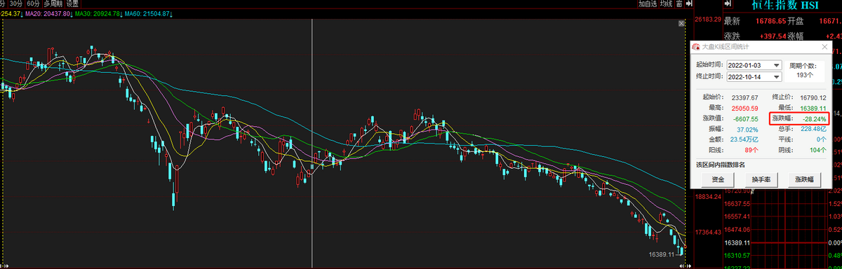 今年来,恒生指数累计下跌超25%。截至2022年10月14日收盘,恒生指数距离2011年10月4日的十一年来最低点16170.35点仅差424.39点。