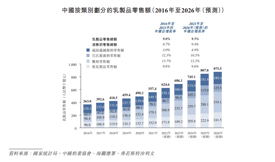 澳亚集团招股说明书内容显示,国内乳制品零售额由2016年的人民币3630亿元大幅增至2021年的人民币5574亿元,年复合增长率为9.0%。2021年,乳制品零售额显著增长13.7%。此外,乳制品零售总额预计将于2026年达到人民币8755亿元,2021年至2026年的年复合增长率为9.5%。