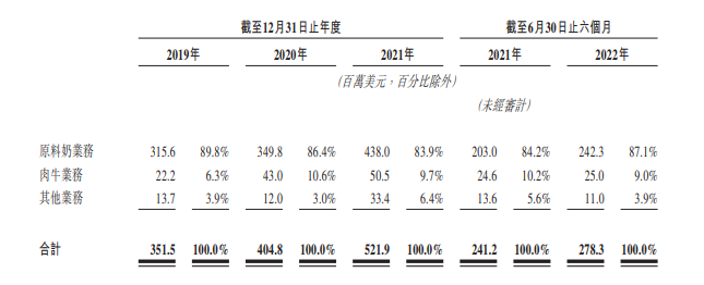 从收入构成来看,澳亚集团主要包括原料奶业务收入、肉牛业务收入及其他业务收入。截至2022年6月30日止六个月,原料奶业务收入、肉牛业务收入及其他业务收入分别为,242.3百万美元、25.0百万美元、11.0百万美元,收入占比分别为87.1%、9.0%、3.9%,其中原料奶业务收入占比接近九成。