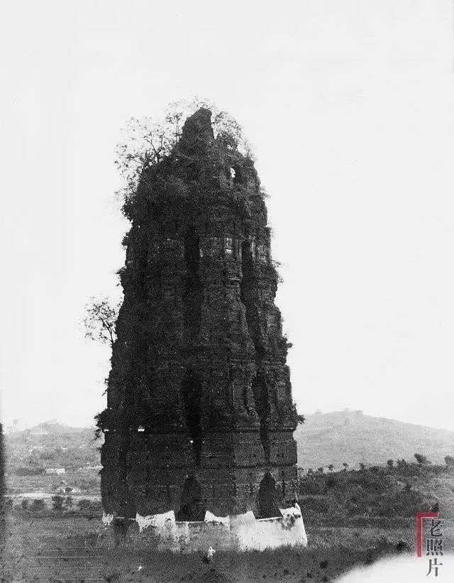 晚清时,尚未倒塌的西湖雷峰塔,塔下面有一个左手叉腰站着的人,显示出塔的高大