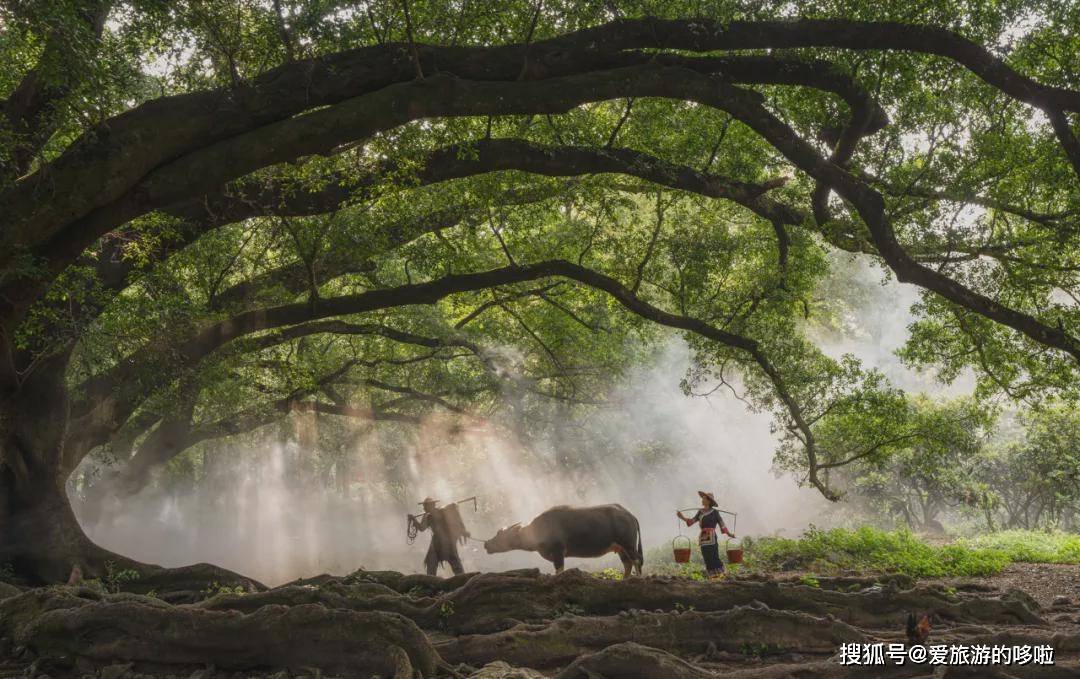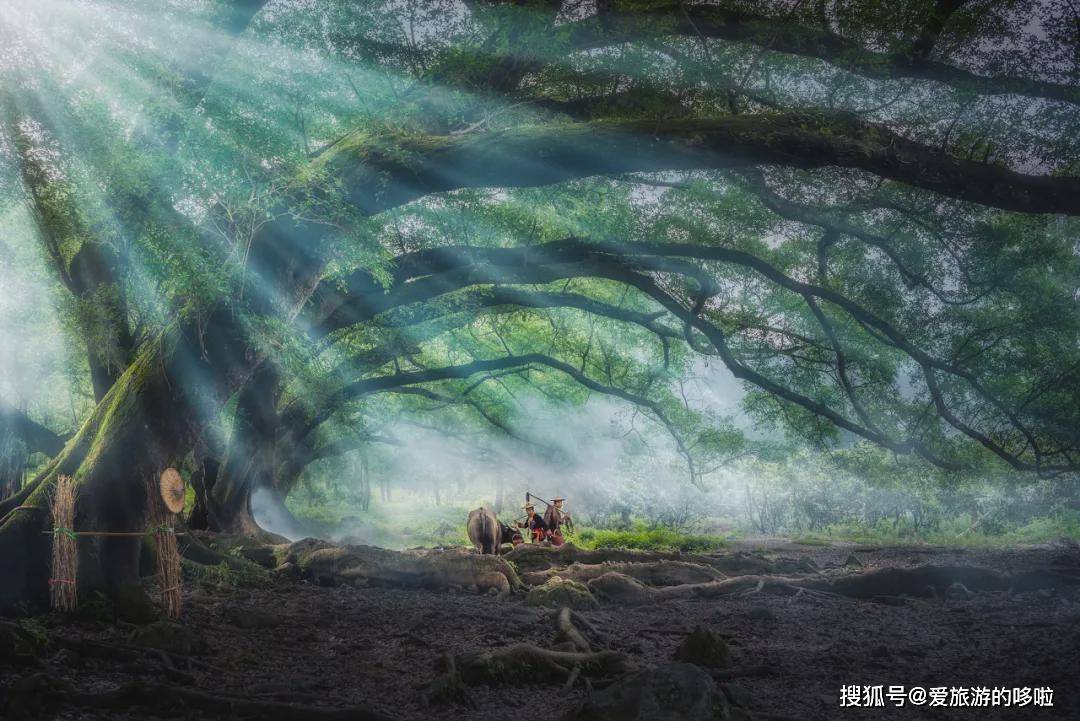 穿蓑衣的农夫牵着牛,畲族阿婆挑着担,光线穿过树梢,形成一束束光影直射在他们身上,仿佛回到了那个男耕女织的淳朴年代。