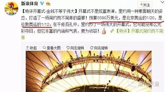 这不,里约奥运会开幕式结束后,喷子们再次发现无法从效果方面黑中国,于是它们转而造谣说北京奥运会开幕式的花费高得不得了,是巴西里约奥运会的20倍——