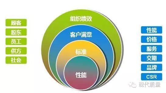 以上图片展示了质量概念的逐步变化:性能-标准-客户满意-组织绩效。其中客户满意的主要分指标是右侧六项、组织绩效的主要分指标是左侧五项。