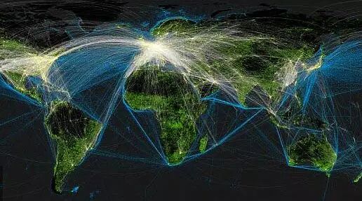 这件事情后就留意在飞机上拍飞机这档子事了,然后就慢慢想清楚了:在飞机上拍别的飞机其实不是什么很困难的事情,因为空中飞机多啊。下图是全球航线分布——